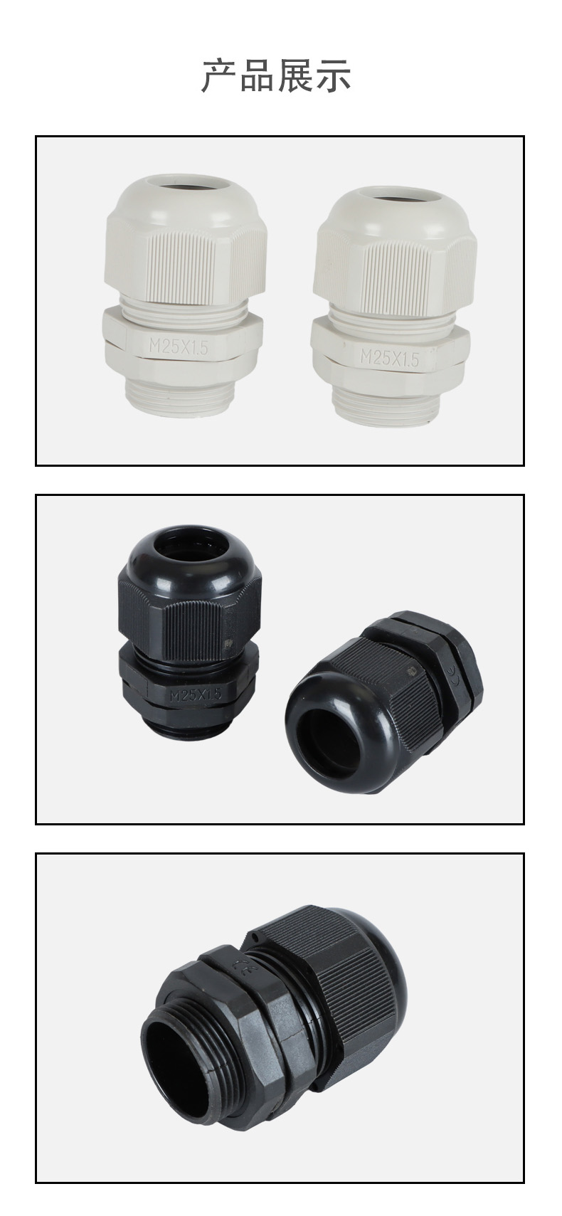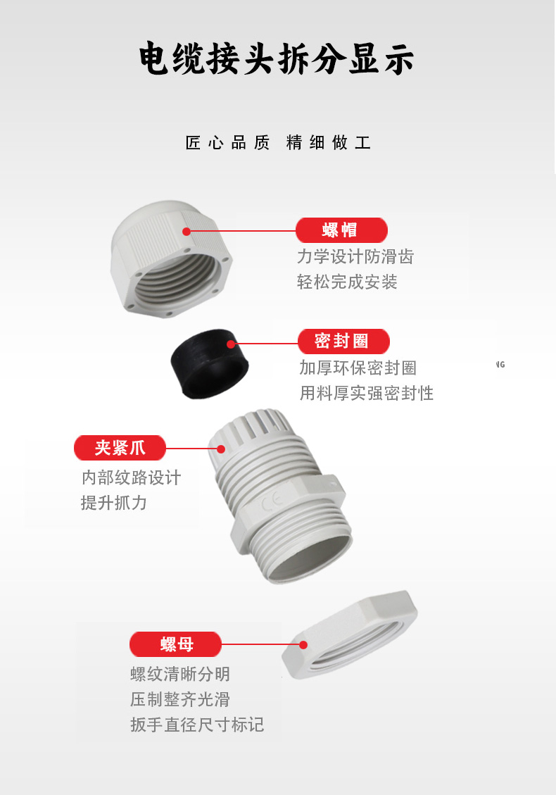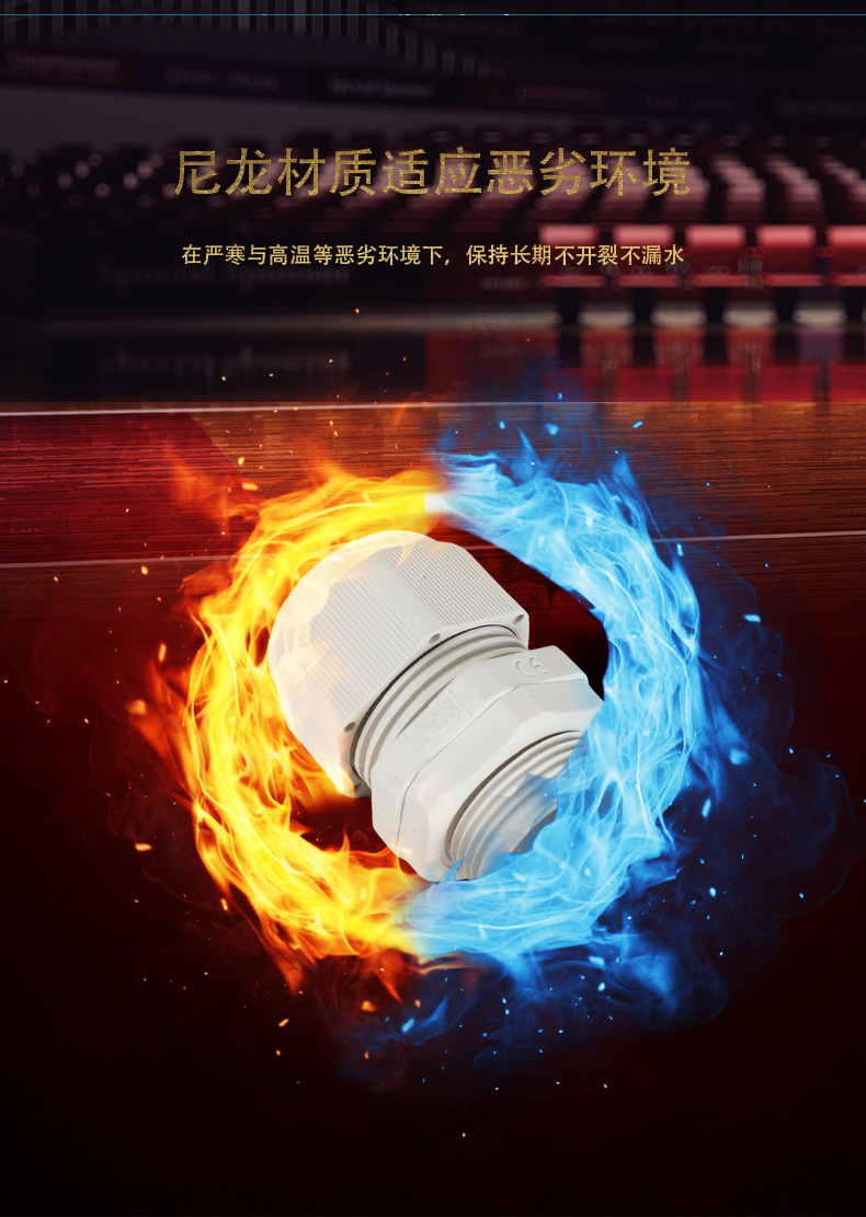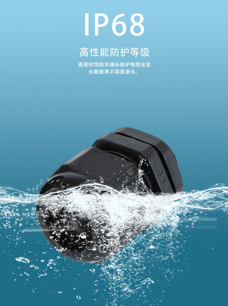 尼龍材質(zhì)適用惡劣環(huán)境紅、灰、黑、深灰、白、藍(lán) 六種顏色常規(guī):黑、灰兩種顏色,其它顏色需要定做在嚴(yán)寒與高溫等惡劣環(huán)境下,保持長期不開裂不漏水高密封性防水接頭保護(hù)電纜安全,長期使用不容易滲水