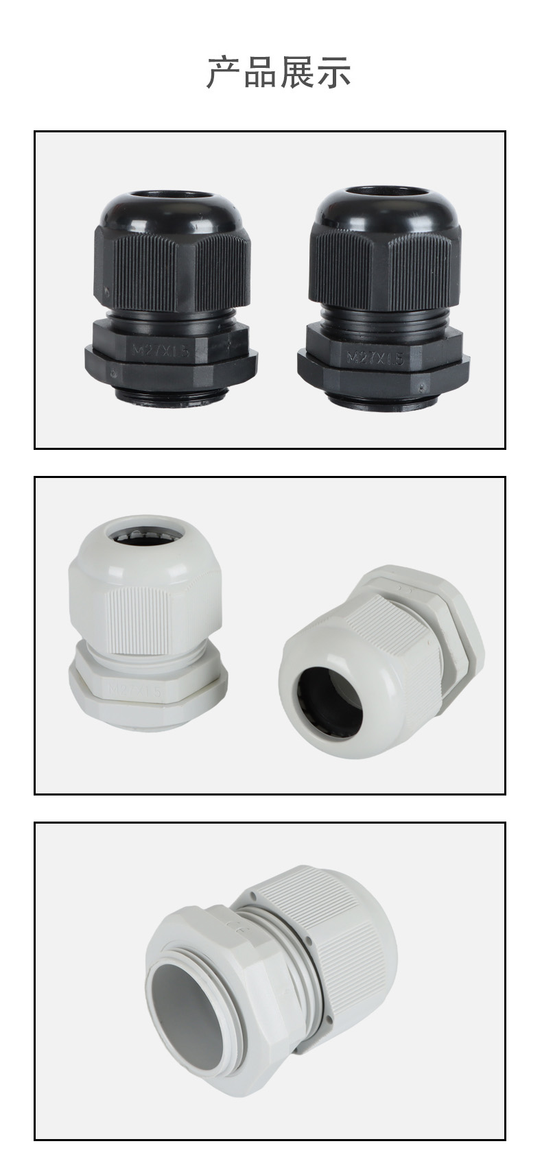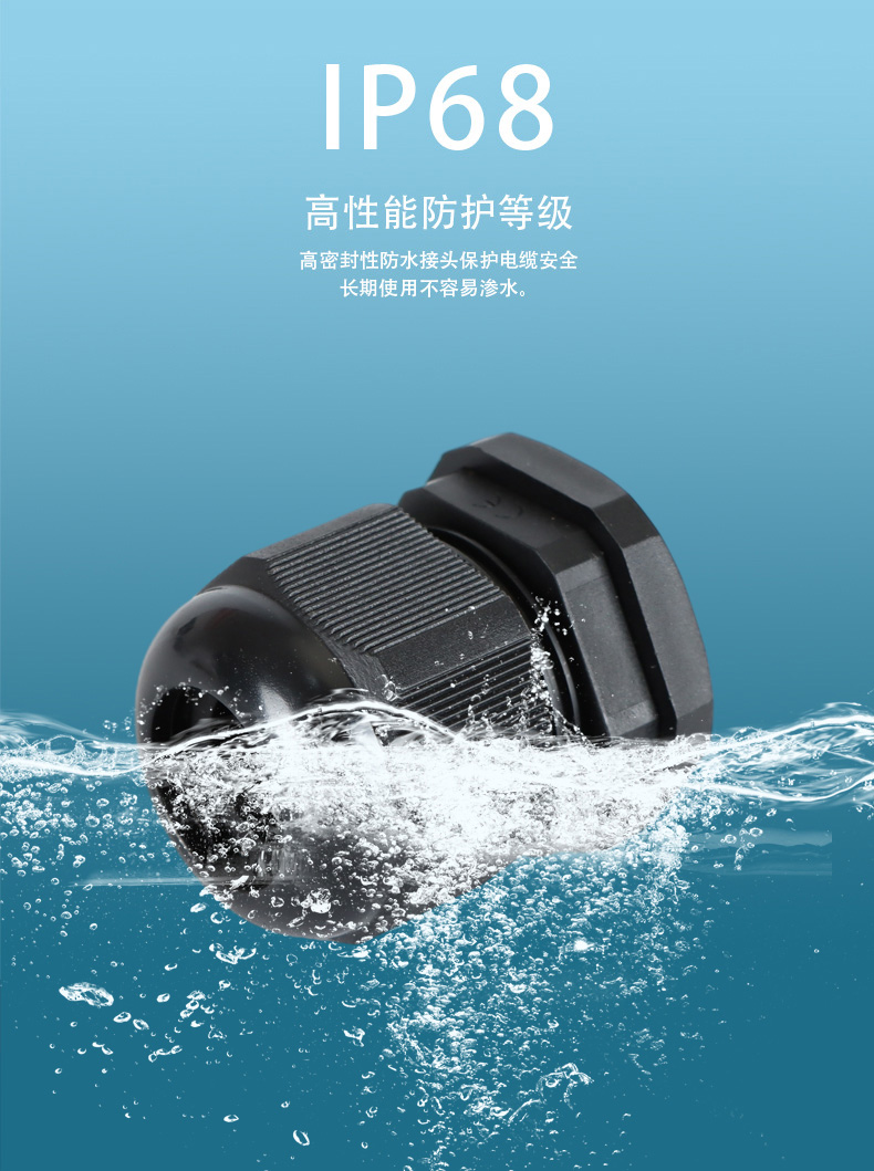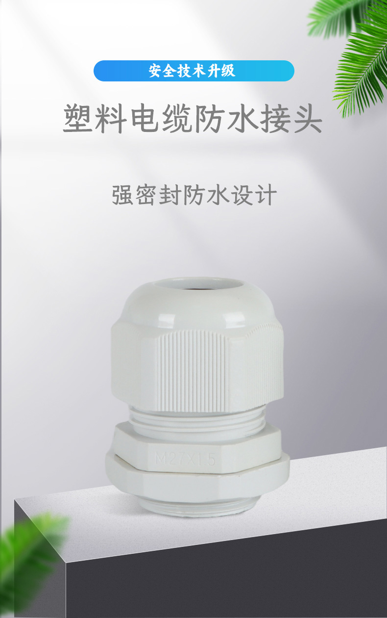 尼龍材質(zhì)適用惡劣環(huán)境紅、灰、黑、深灰、白、藍(lán) 六種顏色常規(guī):黑、灰兩種顏色,其它顏色需要定做在嚴(yán)寒與高溫等惡劣環(huán)境下,保持長(zhǎng)期不開裂不漏水高密封性防水接頭保護(hù)電纜安全,長(zhǎng)期使用不容易滲水
