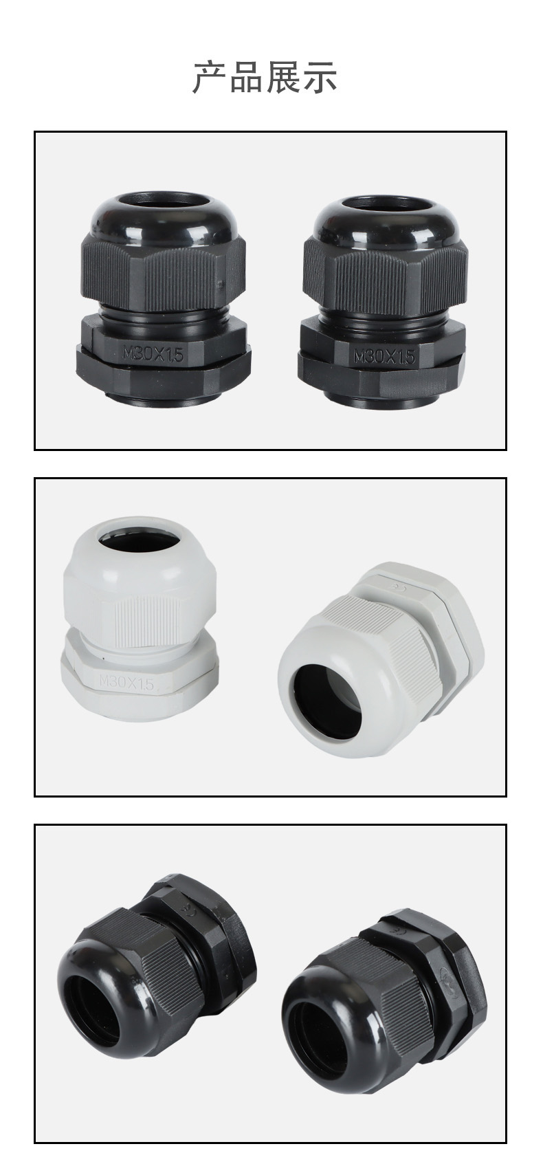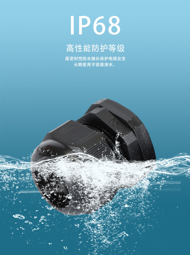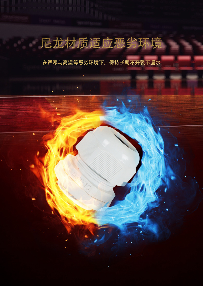 尼龍材質(zhì)適用惡劣環(huán)境紅、灰、黑、深灰、白、藍(lán) 六種顏色常規(guī):黑、灰兩種顏色,其它顏色需要定做在嚴(yán)寒與高溫等惡劣環(huán)境下,保持長期不開裂不漏水高密封性防水接頭保護(hù)電纜安全,長期使用不容易滲水