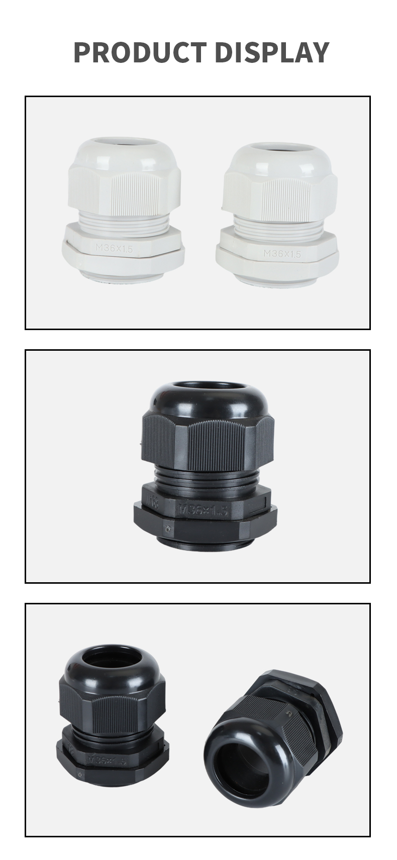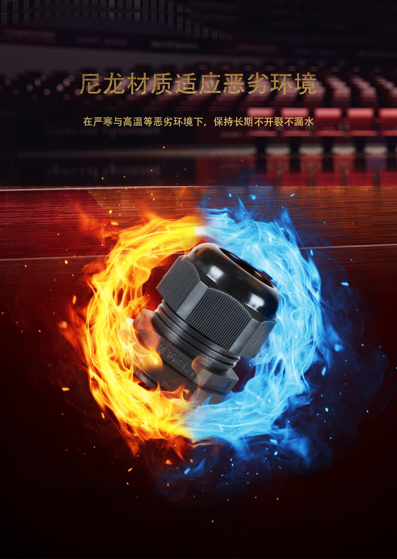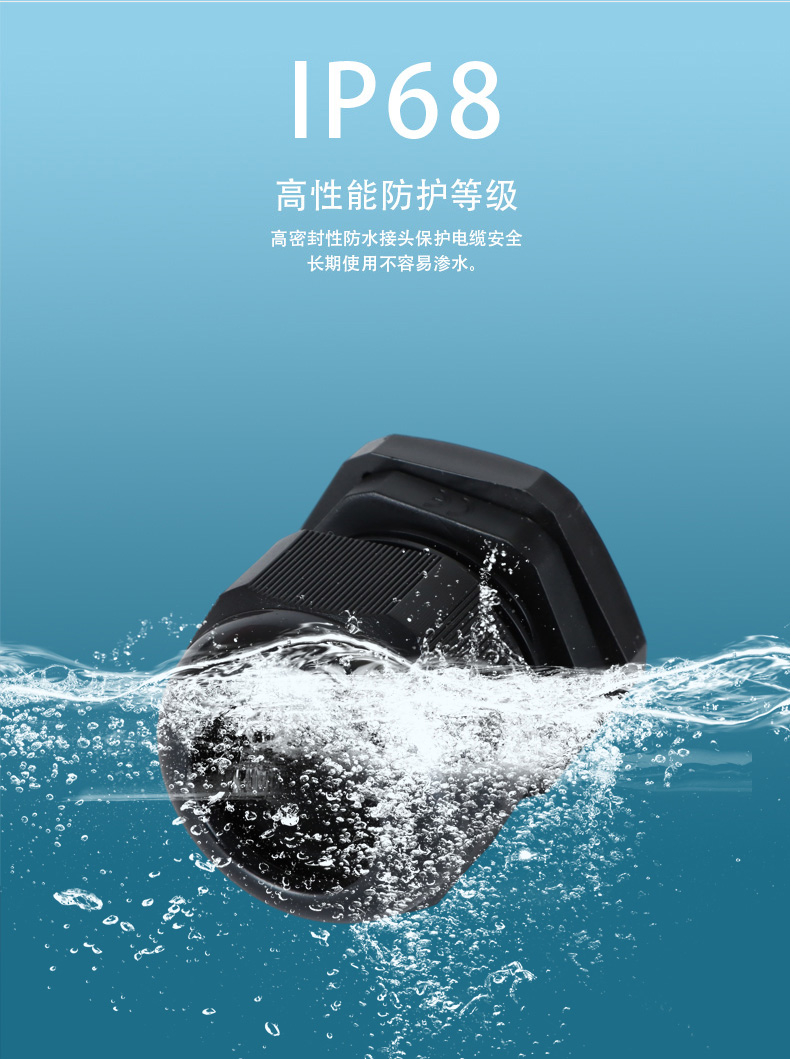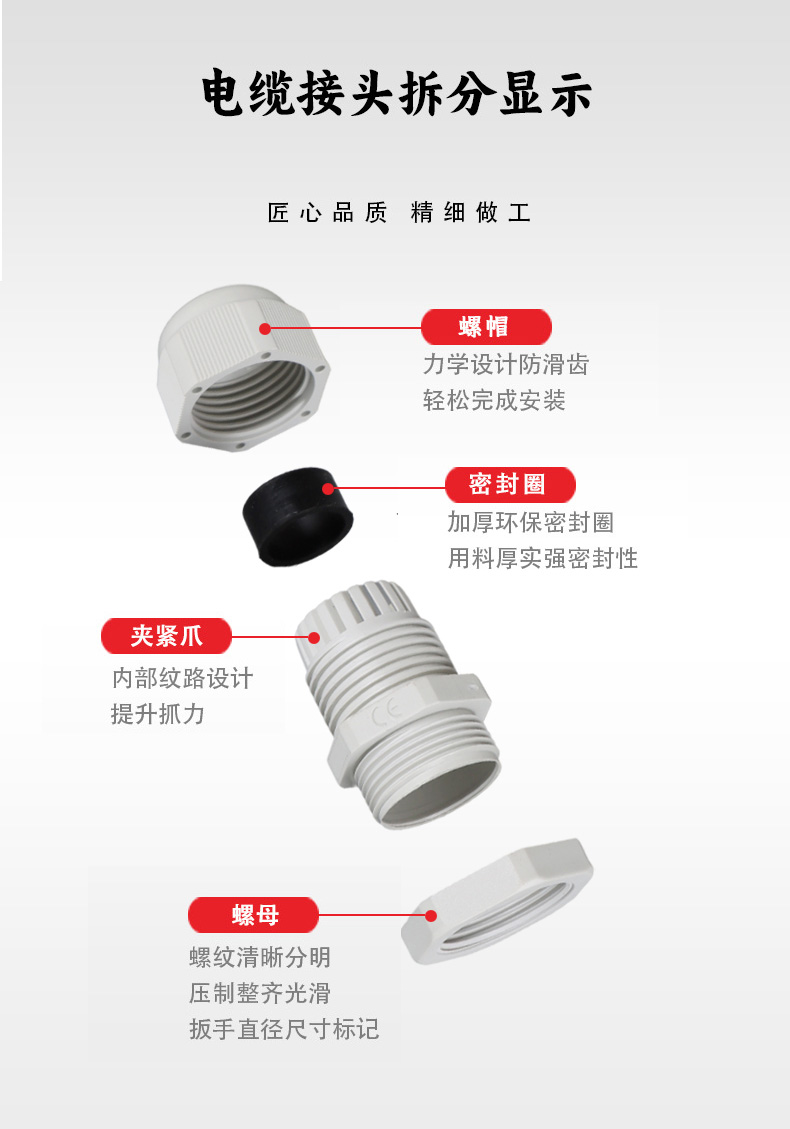 尼龍材質(zhì)適用惡劣環(huán)境紅、灰、黑、深灰、白、藍(lán) 六種顏色常規(guī):黑、灰兩種顏色,其它顏色需要定做在嚴(yán)寒與高溫等惡劣環(huán)境下,保持長期不開裂不漏水高密封性防水接頭保護(hù)電纜安全,長期使用不容易滲水