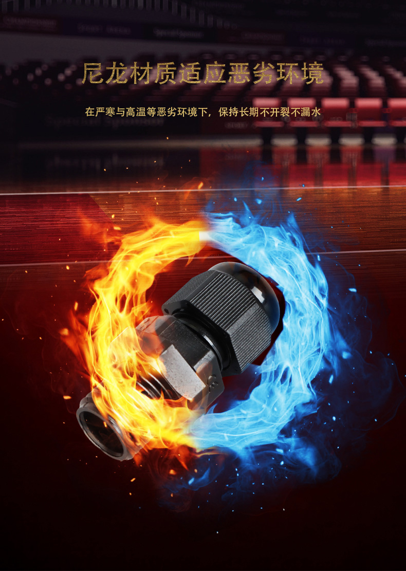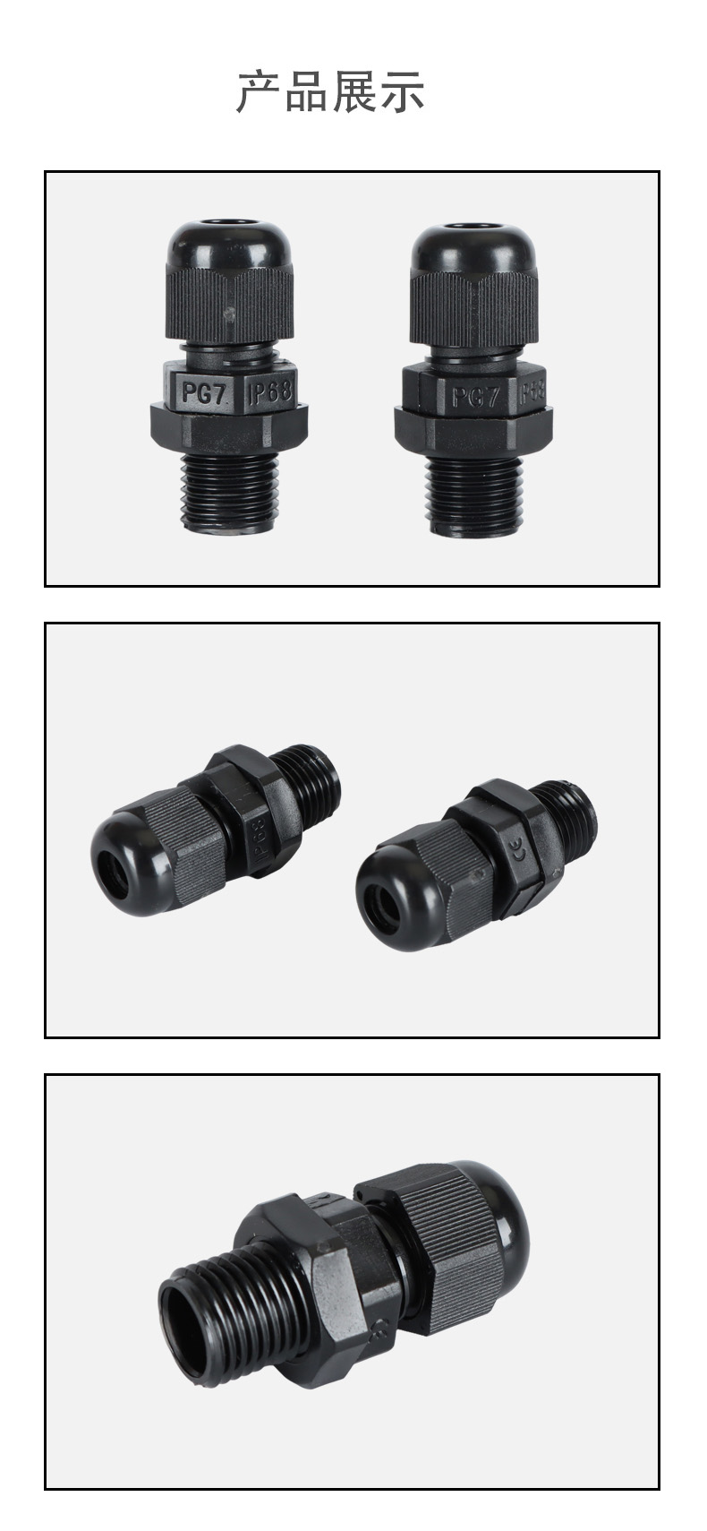 尼龍材質(zhì)適用惡劣環(huán)境紅、灰、黑、深灰、白、藍(lán) 六種顏色常規(guī):黑、灰兩種顏色,其它顏色需要定做在嚴(yán)寒與高溫等惡劣環(huán)境下,保持長(zhǎng)期不開裂不漏水高密封性防水接頭保護(hù)電纜安全,長(zhǎng)期使用不容易滲水