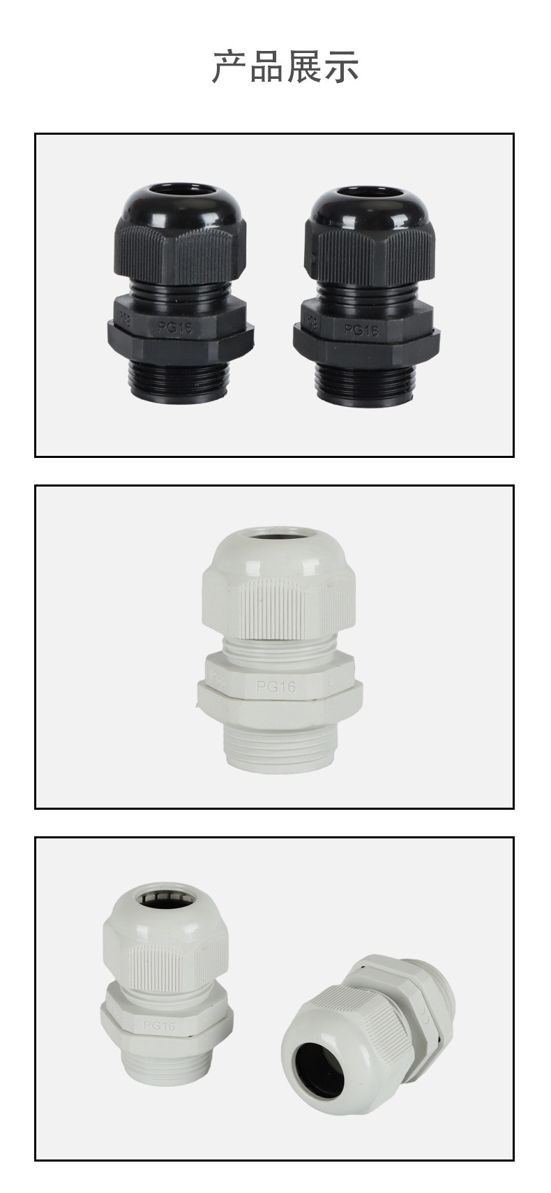 尼龍材質(zhì)適用惡劣環(huán)境紅、灰、黑、深灰、白、藍 六種顏色常規(guī):黑、灰兩種顏色,其它顏色需要定做在嚴寒與高溫等惡劣環(huán)境下,保持長期不開裂不漏水高密封性防水接頭保護電纜安全,長期使用不容易滲水