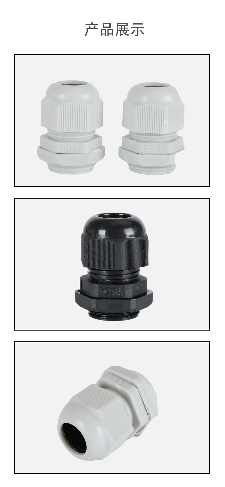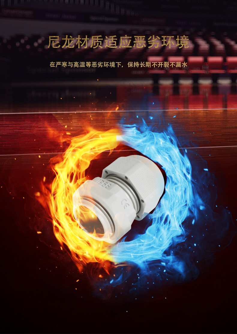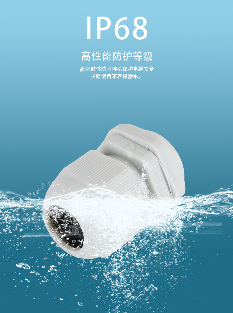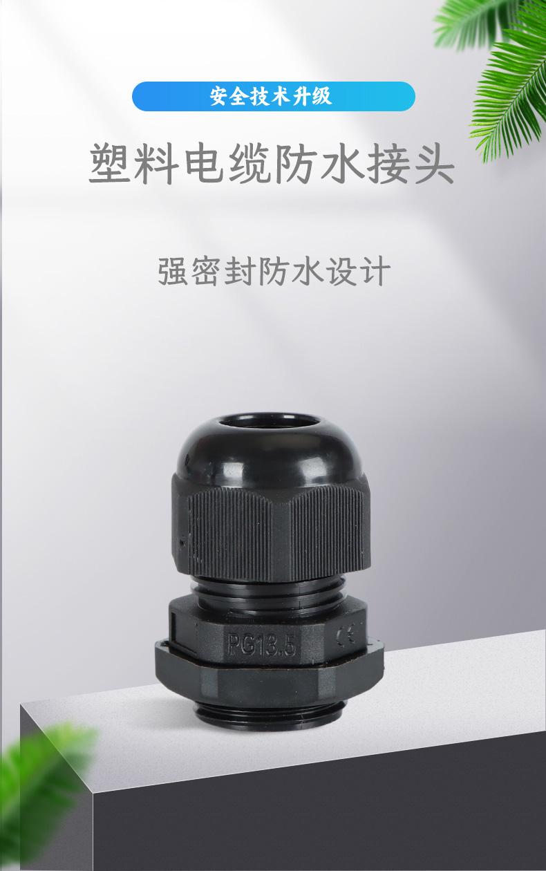 尼龍材質(zhì)適用惡劣環(huán)境紅、灰、黑、深灰、白、藍 六種顏色常規(guī):黑、灰兩種顏色,其它顏色需要定做在嚴寒與高溫等惡劣環(huán)境下,保持長期不開裂不漏水高密封性防水接頭保護電纜安全,長期使用不容易滲水