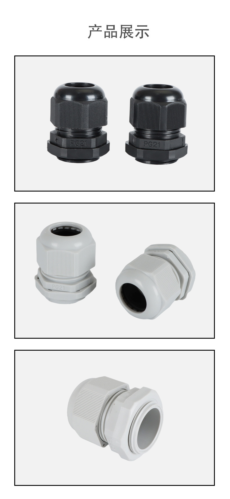 尼龍材質(zhì)適用惡劣環(huán)境紅、灰、黑、深灰、白、藍(lán) 六種顏色常規(guī):黑、灰兩種顏色,其它顏色需要定做在嚴(yán)寒與高溫等惡劣環(huán)境下,保持長(zhǎng)期不開裂不漏水高密封性防水接頭保護(hù)電纜安全,長(zhǎng)期使用不容易滲水