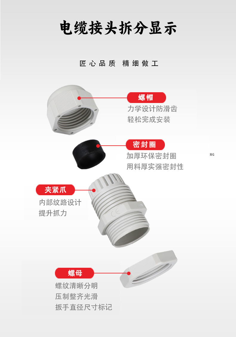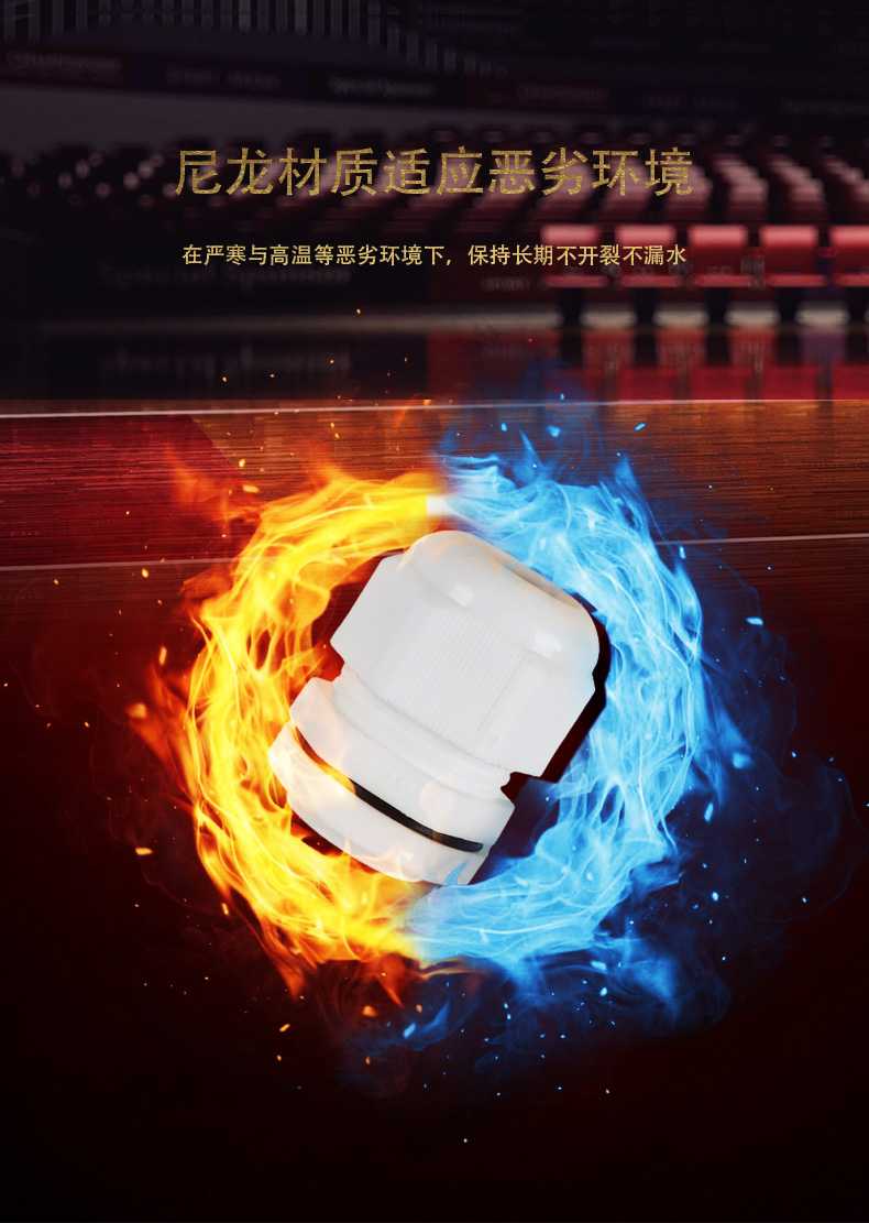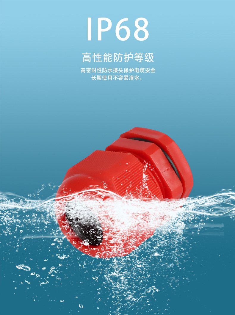 尼龍材質適用惡劣環(huán)境紅、灰、黑、深灰、白、藍 六種顏色常規(guī):黑、灰兩種顏色,其它顏色需要定做在嚴寒與高溫等惡劣環(huán)境下,保持長期不開裂不漏水高密封性防水接頭保護電纜安全,長期使用不容易滲水