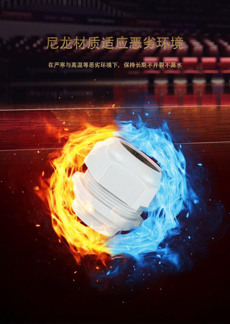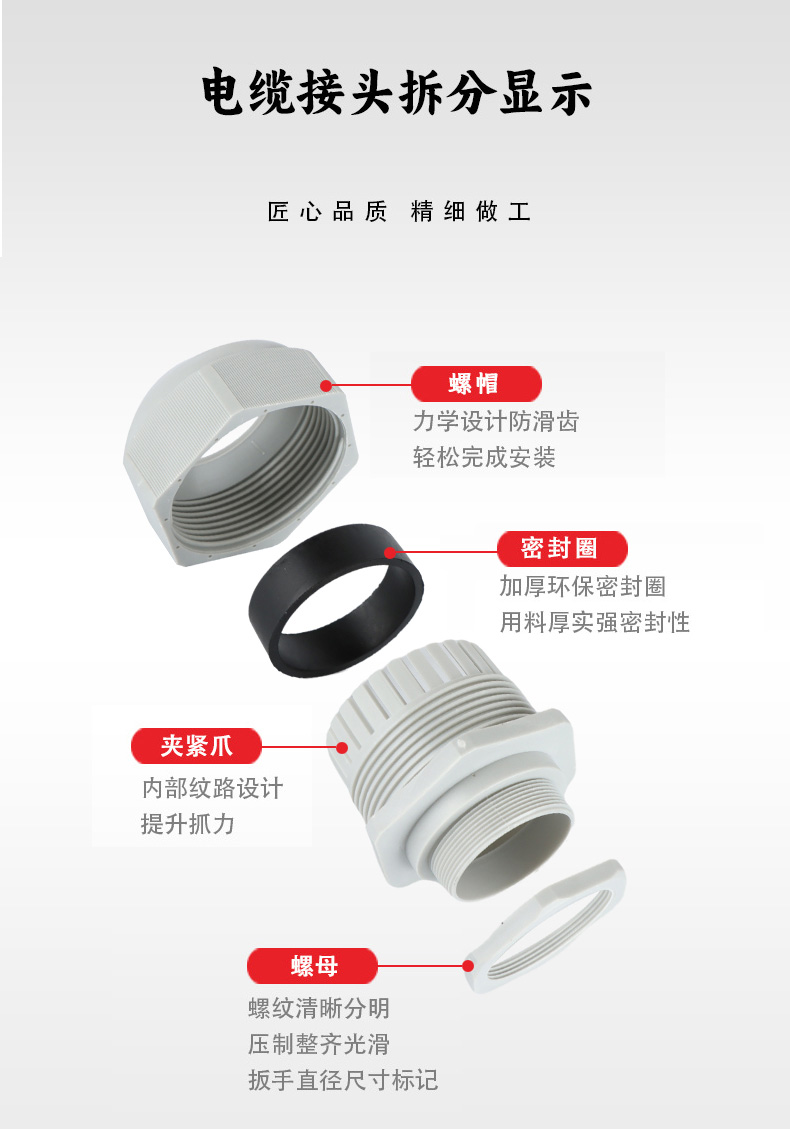 尼龍材質(zhì)適用惡劣環(huán)境紅、灰、黑、深灰、白、藍(lán) 六種顏色常規(guī):黑、灰兩種顏色,其它顏色需要定做在嚴(yán)寒與高溫等惡劣環(huán)境下,保持長(zhǎng)期不開裂不漏水高密封性防水接頭保護(hù)電纜安全,長(zhǎng)期使用不容易滲水
