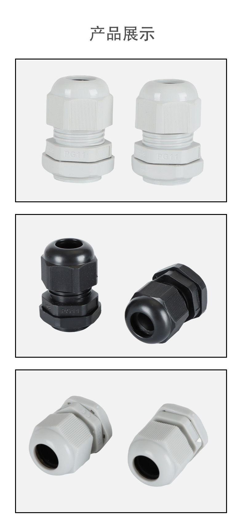 尼龍材質(zhì)適用惡劣環(huán)境紅、灰、黑、深灰、白、藍(lán) 六種顏色常規(guī):黑、灰兩種顏色,其它顏色需要定做在嚴(yán)寒與高溫等惡劣環(huán)境下,保持長(zhǎng)期不開裂不漏水高密封性防水接頭保護(hù)電纜安全,長(zhǎng)期使用不容易滲水