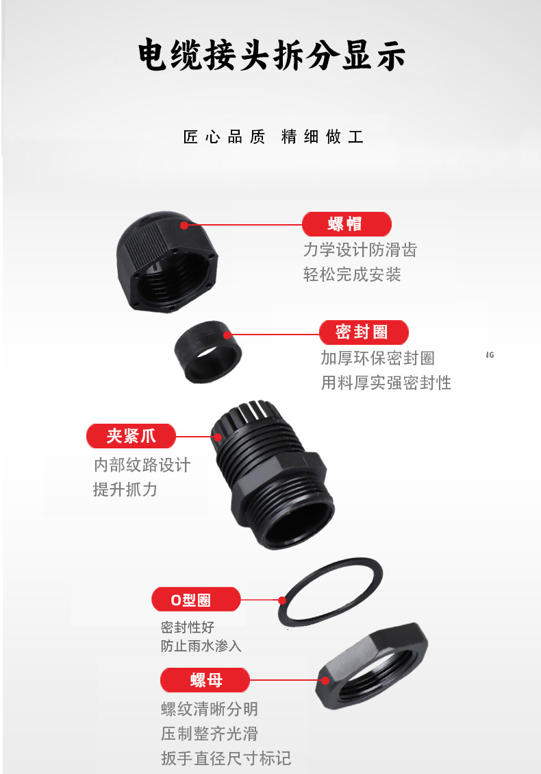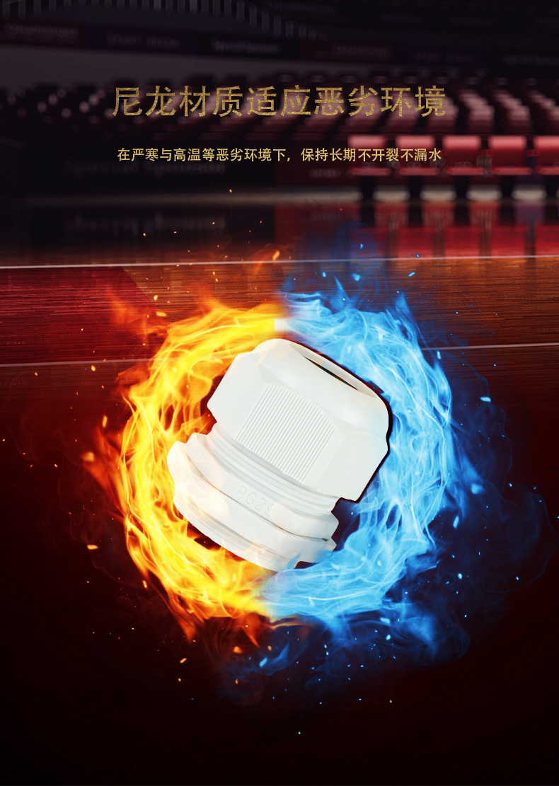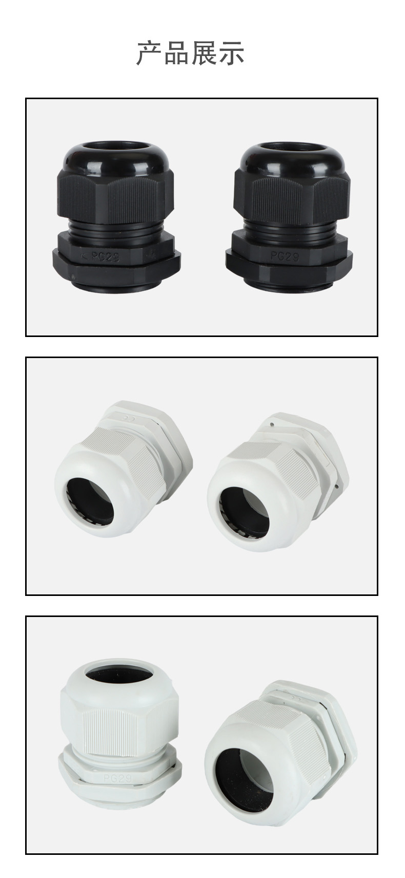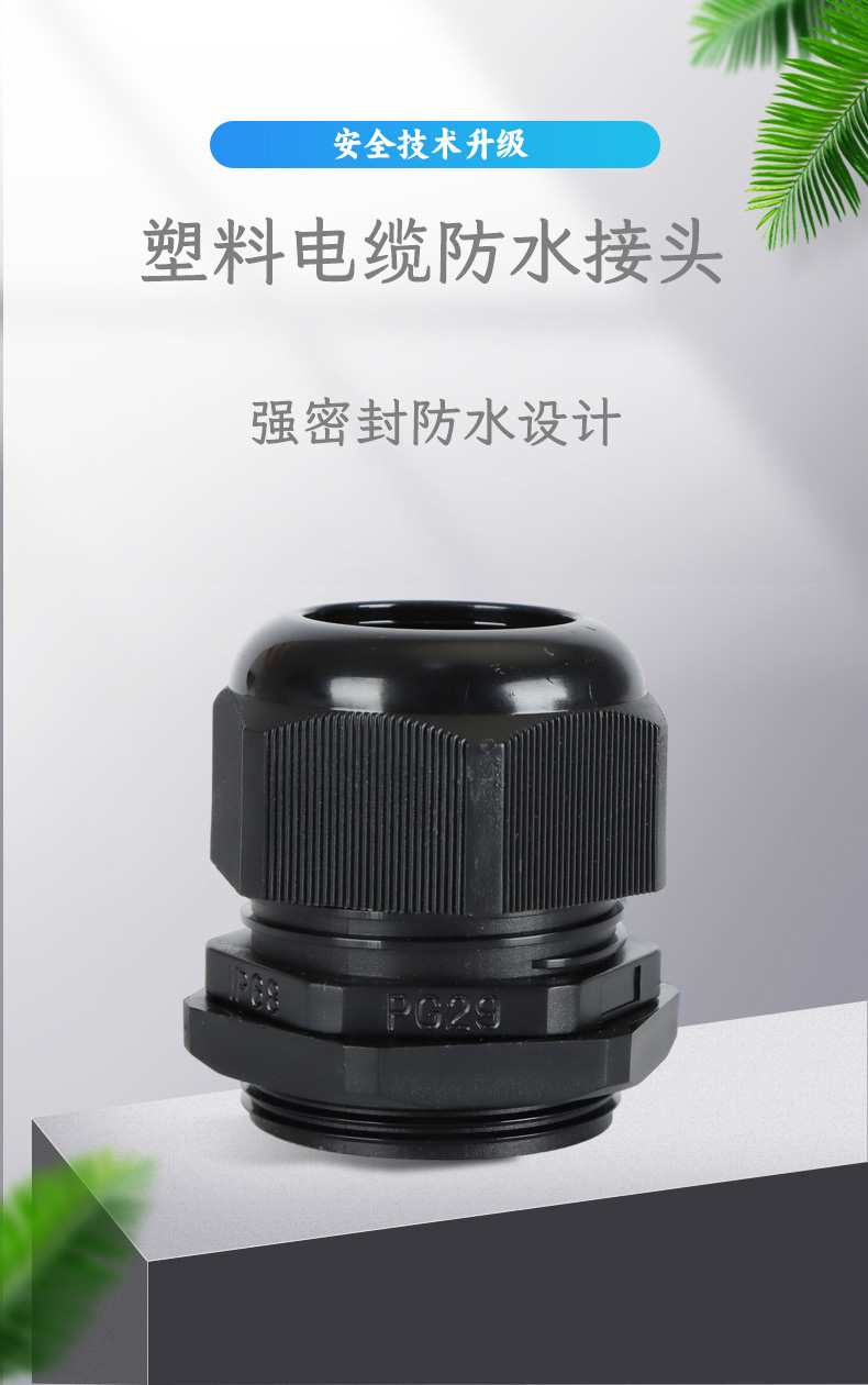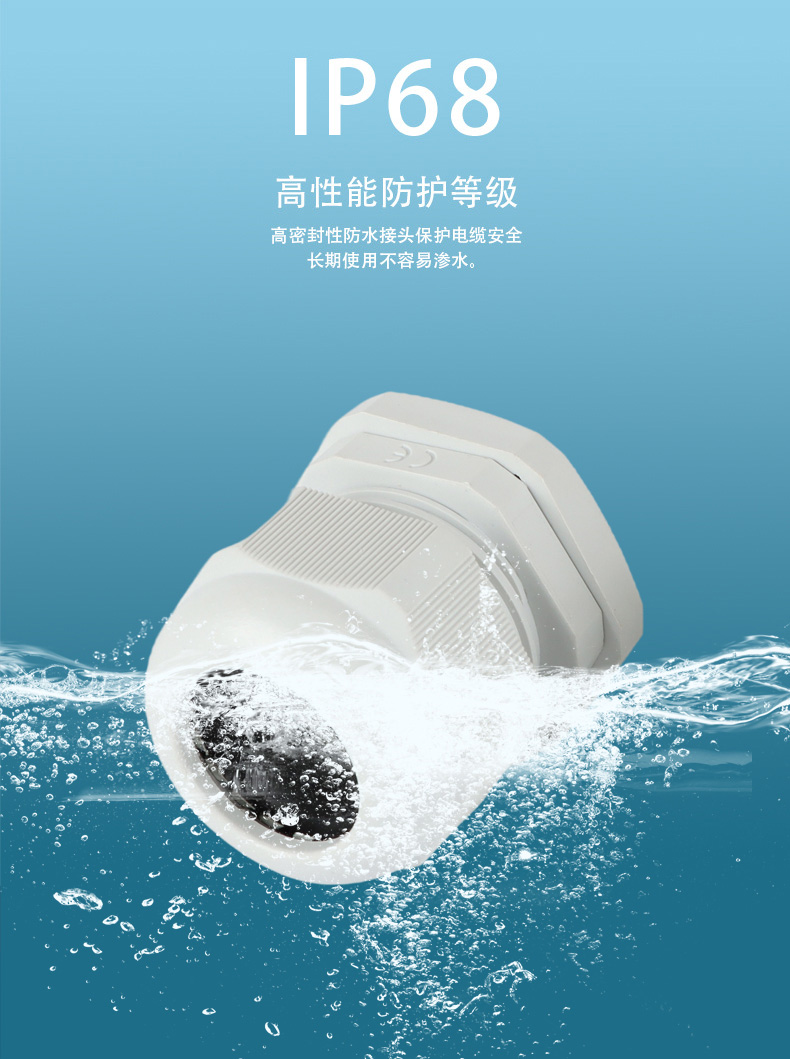 尼龍材質(zhì)適用惡劣環(huán)境紅、灰、黑、深灰、白、藍(lán) 六種顏色常規(guī):黑、灰兩種顏色,其它顏色需要定做在嚴(yán)寒與高溫等惡劣環(huán)境下,保持長(zhǎng)期不開裂不漏水高密封性防水接頭保護(hù)電纜安全,長(zhǎng)期使用不容易滲水