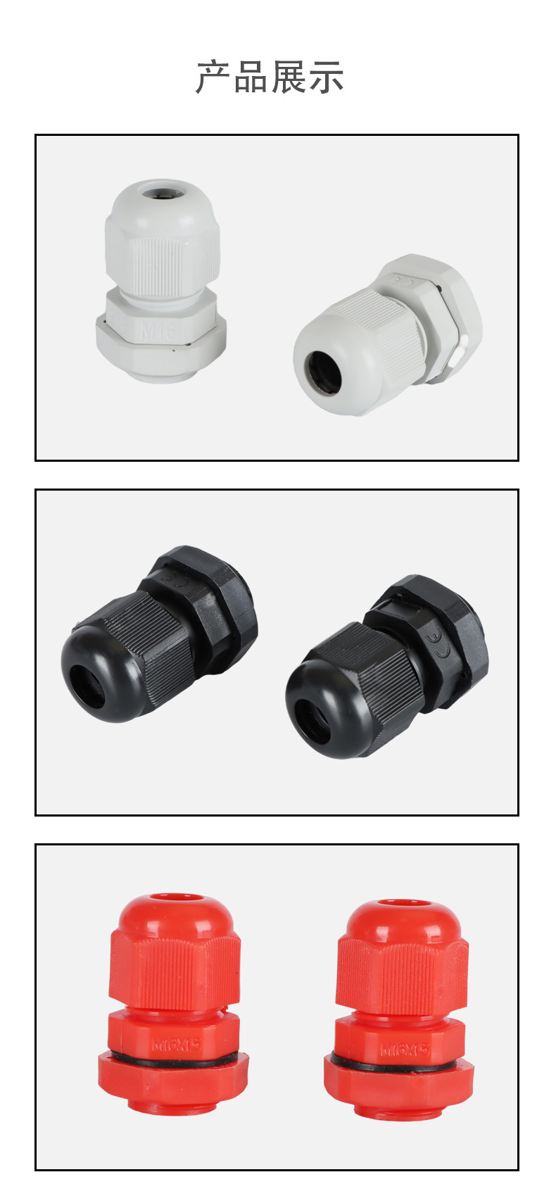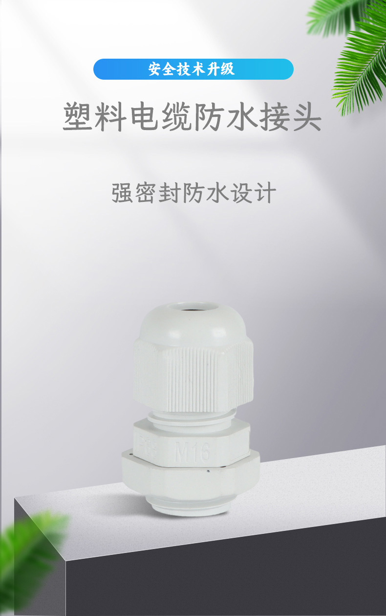 尼龍材質(zhì)適用惡劣環(huán)境紅、灰、黑、深灰、白、藍(lán) 六種顏色常規(guī):黑、灰兩種顏色,其它顏色需要定做在嚴(yán)寒與高溫等惡劣環(huán)境下,保持長期不開裂不漏水高密封性防水接頭保護(hù)電纜安全,長期使用不容易滲水