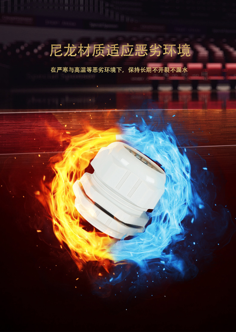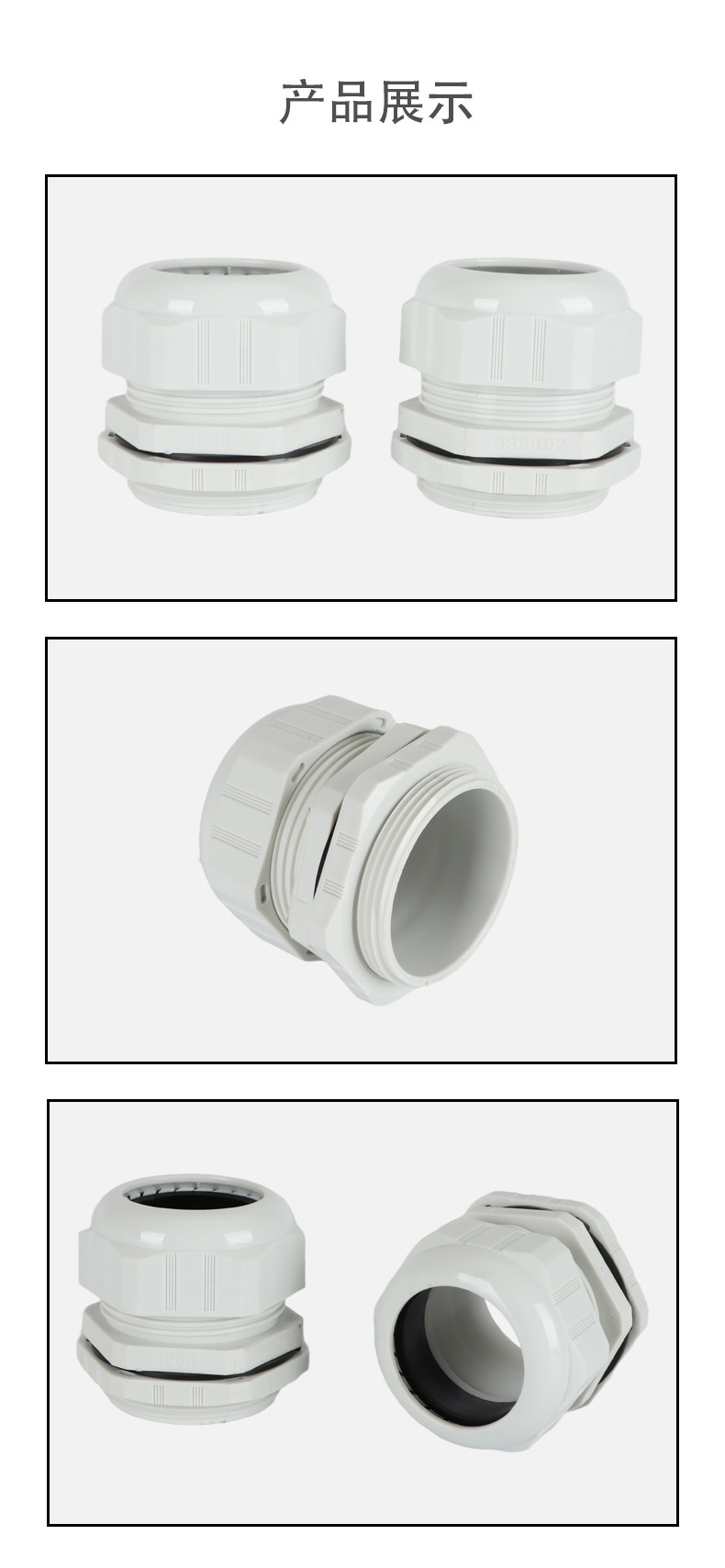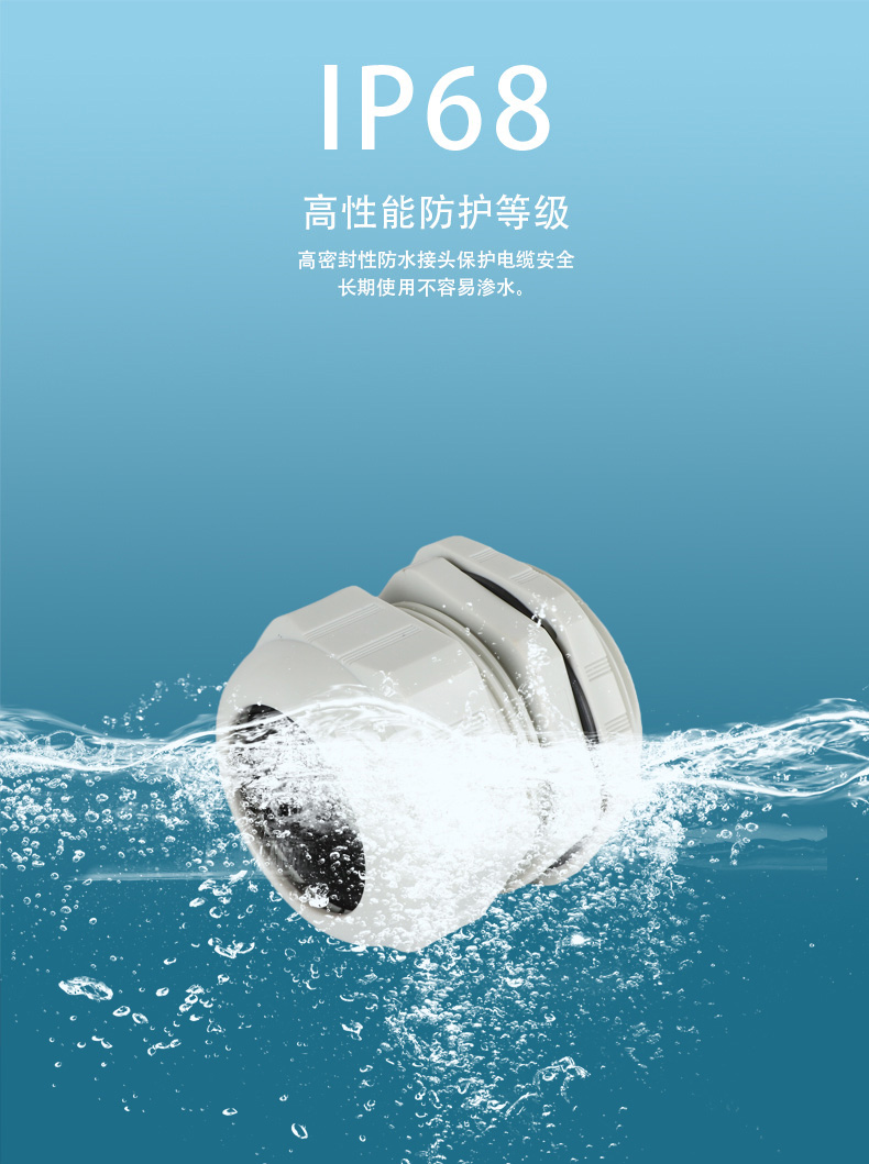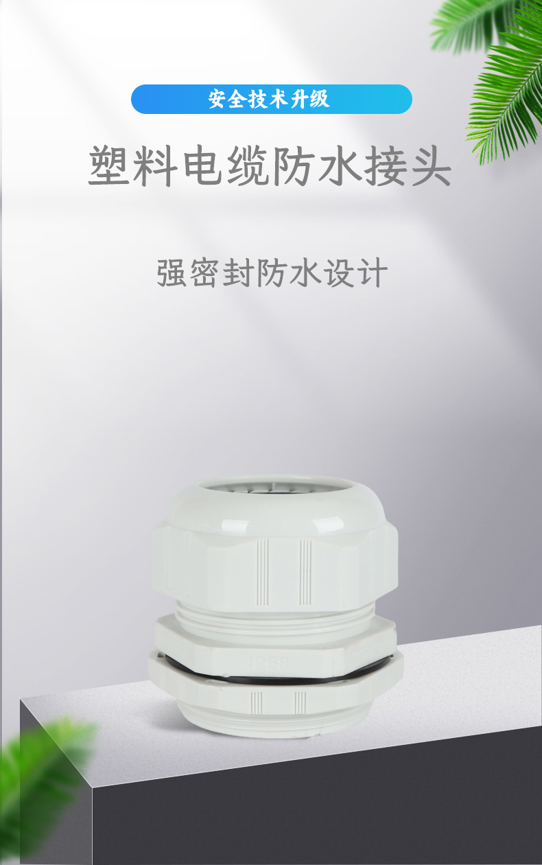 尼龍材質(zhì)適用惡劣環(huán)境紅、灰、黑、深灰、白、藍(lán) 六種顏色常規(guī):黑、灰兩種顏色,其它顏色需要定做在嚴(yán)寒與高溫等惡劣環(huán)境下,保持長期不開裂不漏水高密封性防水接頭保護(hù)電纜安全,長期使用不容易滲水